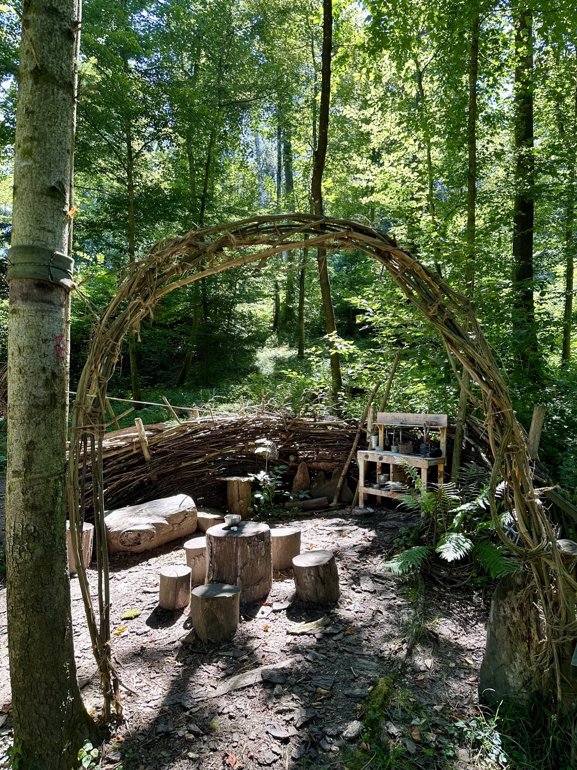 - Waldküche: Lädt ein zum Experimentieren, Wald-Suppen Erfinden, zusammen Spielen, Matschen und bunte Kreide Raspeln. Die Kinder haben die Möglichkeit, voneinander zu lernen, sich gegenseitig zu unterstützen und Konflikte gemeinsam zu lösen.