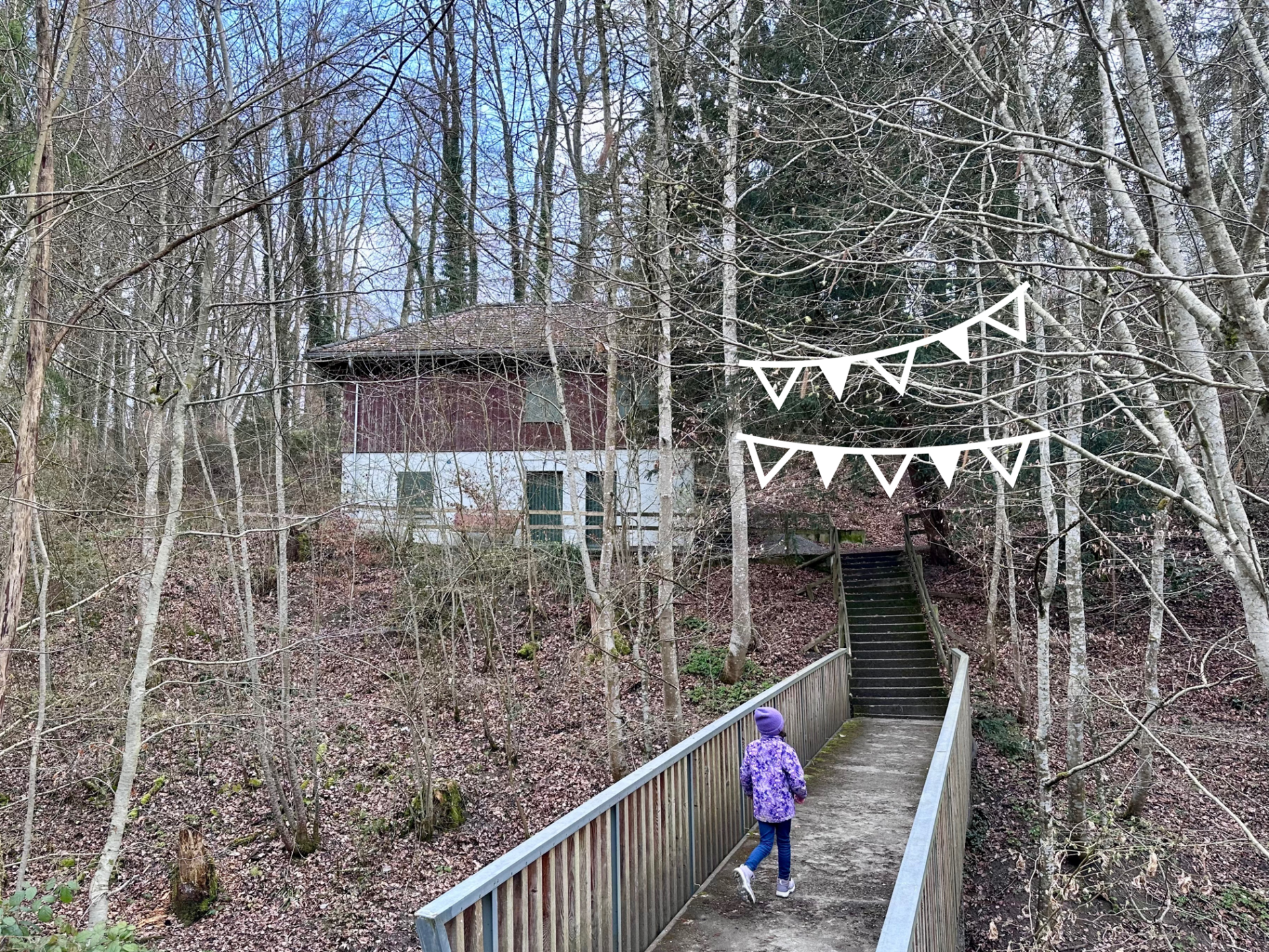 Aussenraum: Hinter dem Haus befindet sich ein kleiner Sitzplatz zum Spielen, Werken und Bewegen in einem geschützten Rahmen und doch mitten im Wald. Die Kinder haben die Möglichkeit, Zwergenhäuser oder Hütten zu bauen, sich mit Schlammrutschen auszutoben, mit Naturmaterial zu experimentieren, Tiere zu beobachten und vieles mehr. Im Sommer ladet das Mühletöbeli-Bächli ein zum Plantschen, Stauen und Brücken bauen.